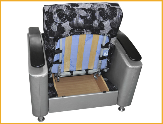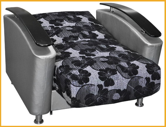 Современная стильная модель. Съемный чехол на спальном месте. Сиденье и спинка сформированы на основе металлокаркаса с деревянными латами, на котором закреплен мягкий мат, состоящий из пружинного блока с настилом из термовойлока и листового пенополиуретана. При помощи трехпозиционного замка трансформации спинка принимает три положения: сидя, полулежа, лежа. В коробчатом основании кресла расположена емкость для хранения спальных принадлежностей. Кресло оснащено декорированными гнутыми подлокотниками.Для трансформации требуется расстояния между стеной и спинкой кресла. При раскладке кресла совместно с пуфом- образуется полноценное спальное место. Подлокотники съемные. Механизм раскладки "клик- кляк".