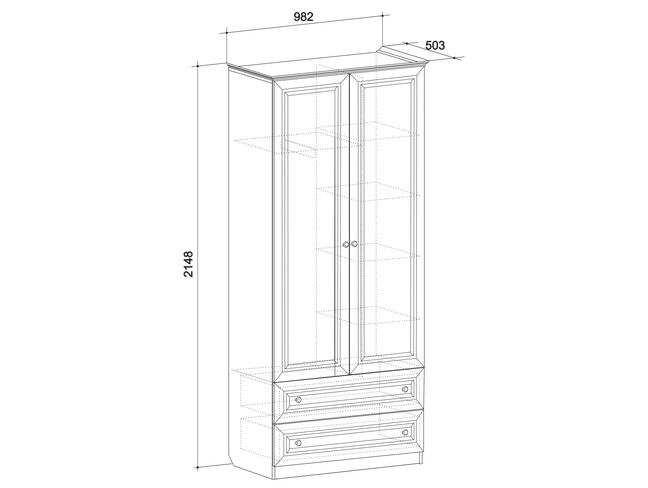 Состоит из: отделения с выдвижной штангой для одежды, полками и 2-х выдвижных ящиков.