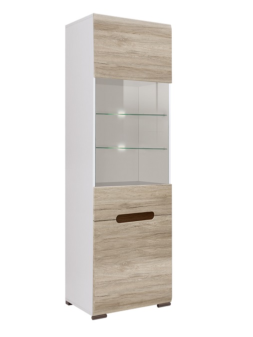 2 распашные двери, верхняя со стеклянной вставкой (стекло – закаленное, бронзовое), за которой расположены 2 полки из ДСП и 2 стеклянных полки (стекло прозрачное), в нижней части 2 полки из ДСП;