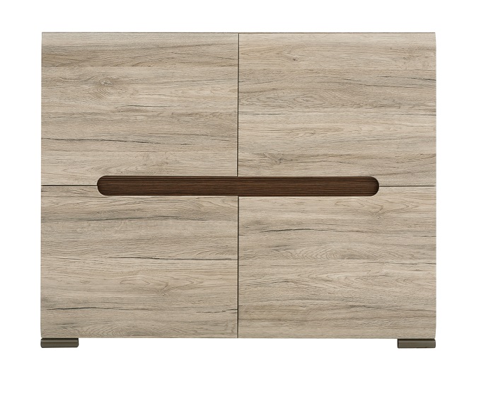 Для открывания дверей используется фрезеровка на нижней панели и верхней панели дверей, которая декорирована с внутренней стороны рифленой планкой из плиты МДФ цвет Дуб венге Магия;