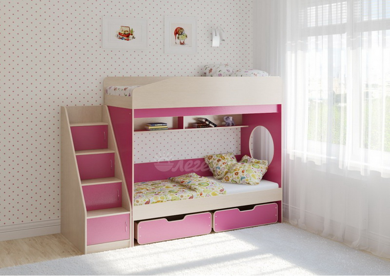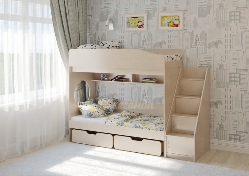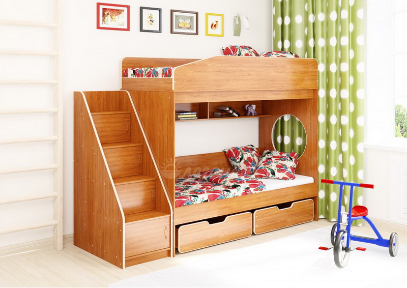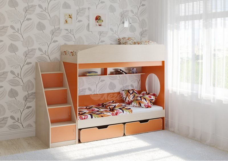 Над нижним спальным местом располагается встроенная двухсекционная полка, в которой удобно хранить книги, учебники, тетради, канцелярию и другие нужные вещи.