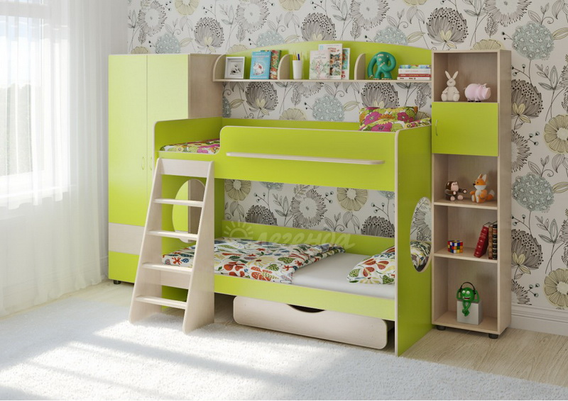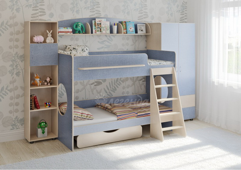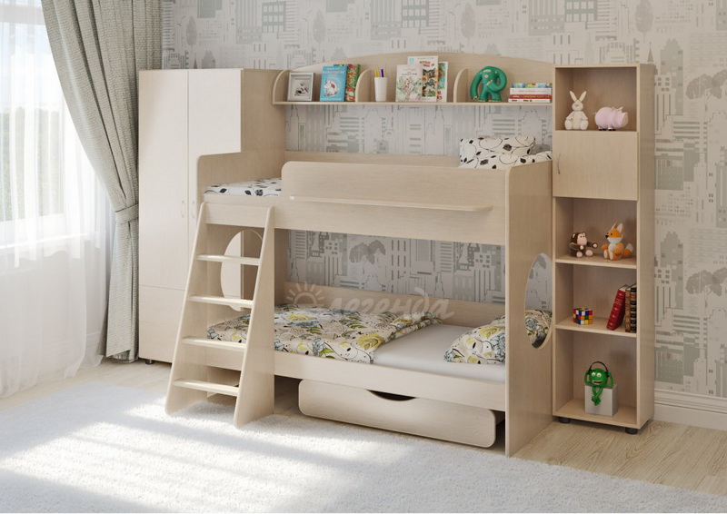 Классическая детская невысокая двухъярусная кровать с двумя параллельными спальными местами размером 1800х800.