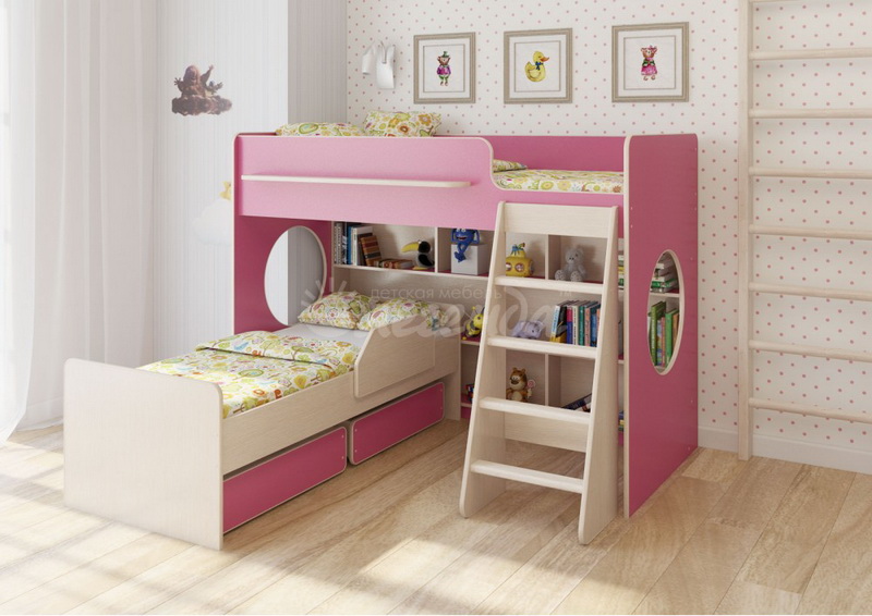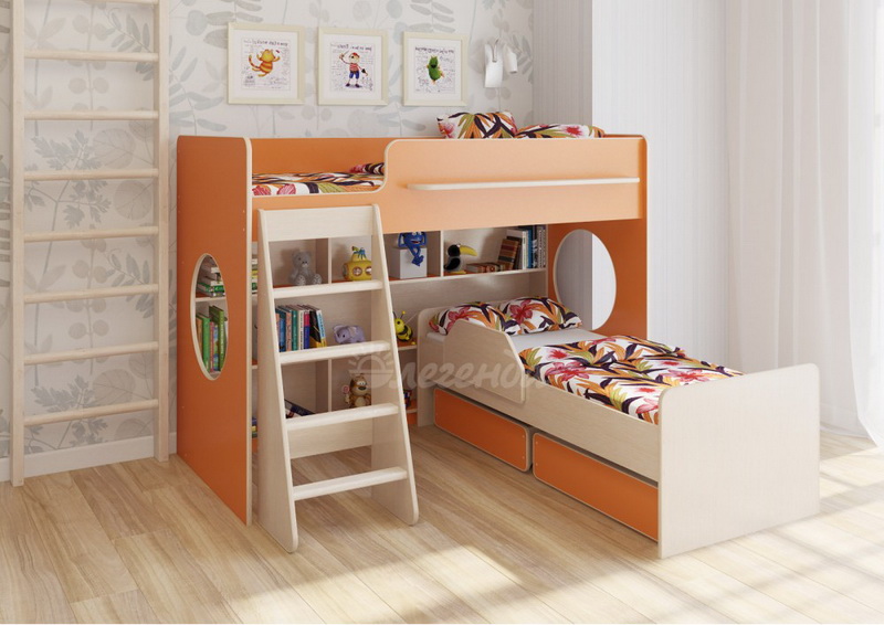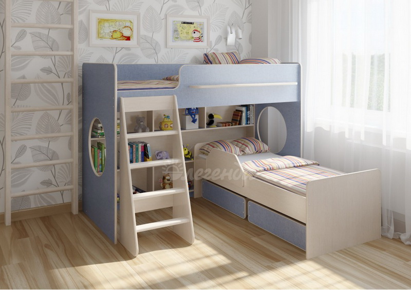 Под верхним спальным местом в игровой зоне располагается стеллаж. Стеллаж отлично подходит для хранения игрушек,удобен для поддержания порядка и сортировки предметов.