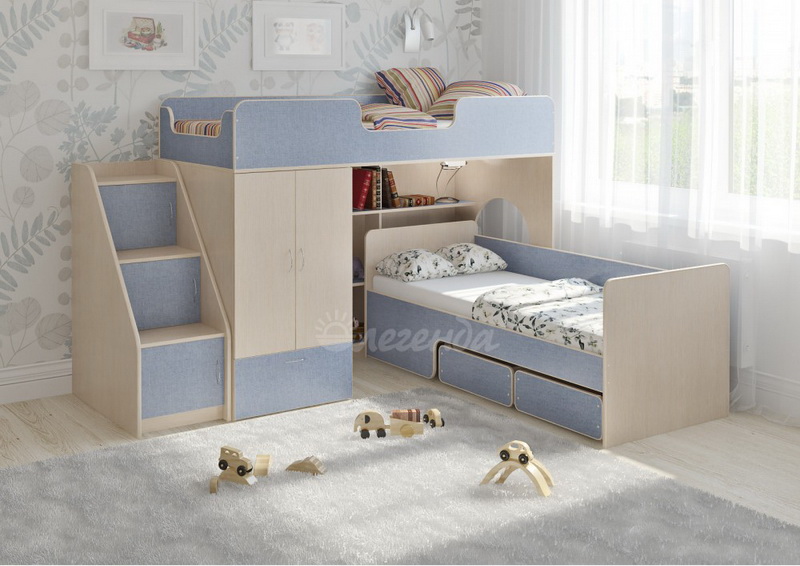Под верхним спальным местом располагается стеллаж,отлично подходящий для хранения игрушек.Стеллаж состоит из трех полок, разделенных на две секции – удобно для поддержания порядка и сортировки предметов.