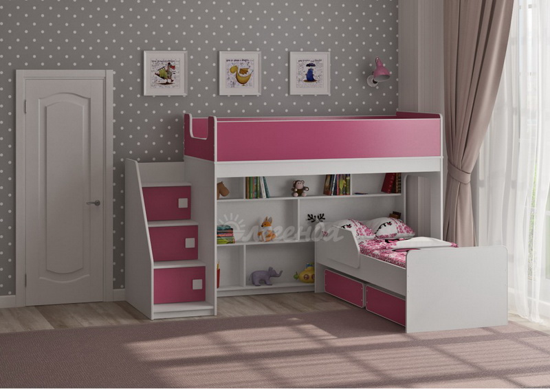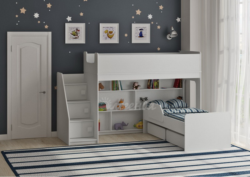 Двухъярусная кровать двумя перпендикулярными спальными местами - 1750х750 и 1600х700 ммВысота кровати – всего 1405 мм. Удобно - взрослый может заправить кровать, не забираясь на второй ярус.