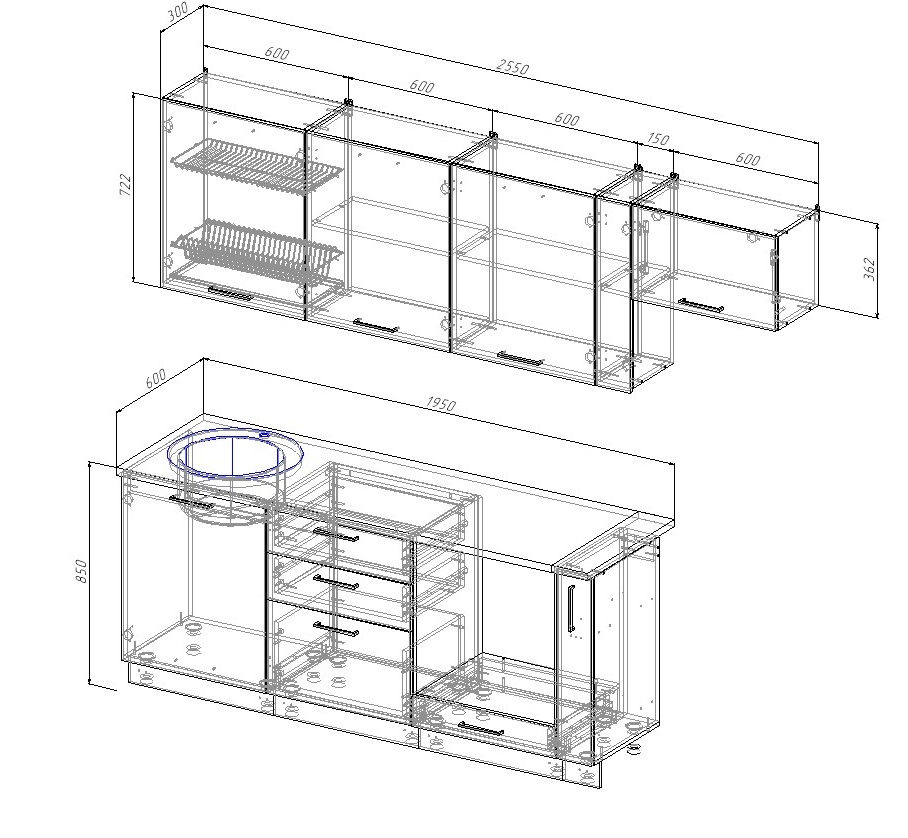 - Фасады со свесом – дают возможность использовать верхние модули без установки ручек, а также установить скрытую подсветку