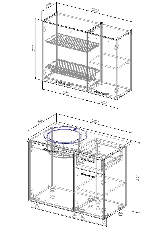 - Фасады со свесом – дают возможность использовать верхние модули без установки ручек, а также установить скрытую подсветку