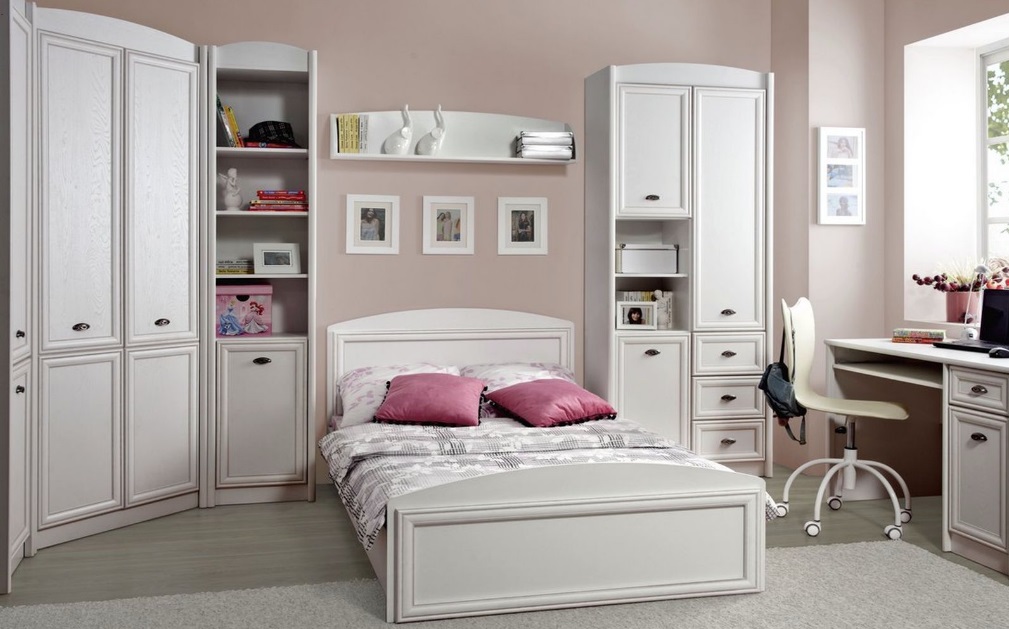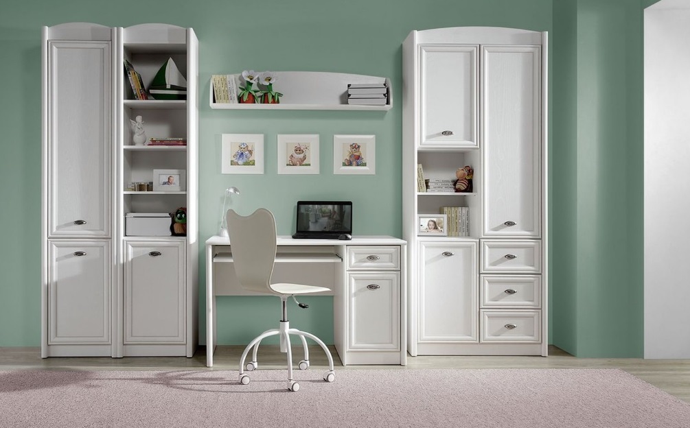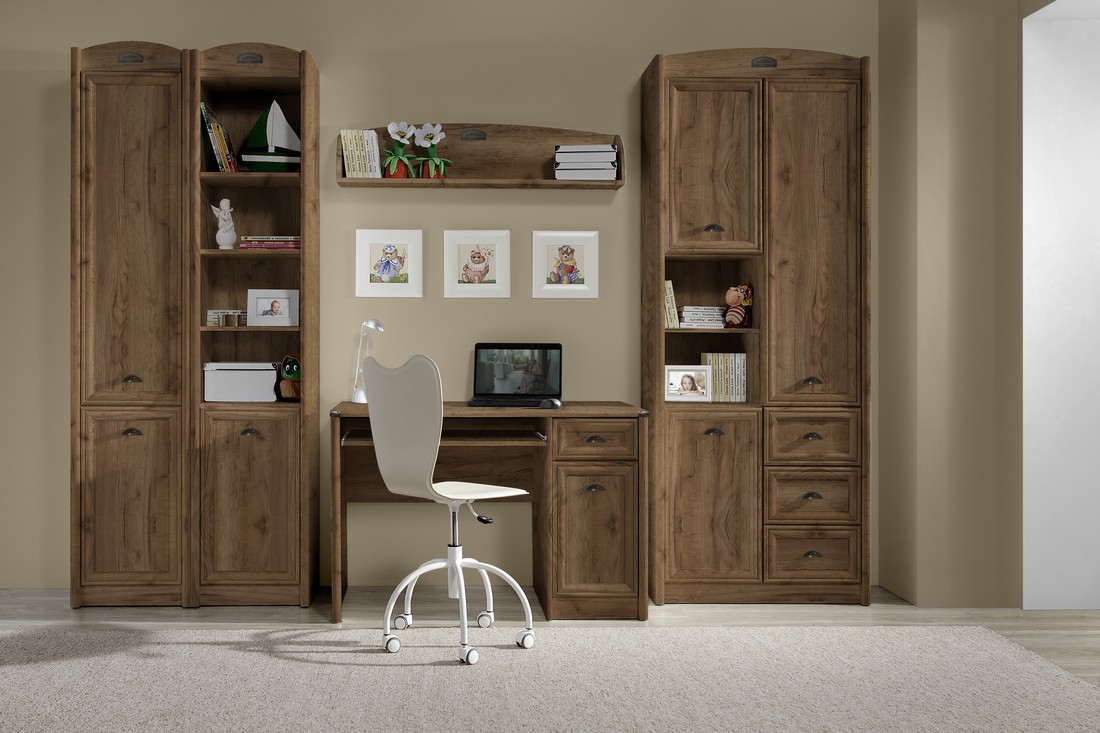 С помощью набора модульной мебели Салерно Вы сможете оформить молодежную комнату. Отличительным акцентом в наборе являются патинированные рамочно-филенчатые конструкции (цвет фасада – белый, цвет патины светло-коричневый), оригинальные металлические ручки в виде «ракушки», закругленные верхние карнизы. В набор включен полный спектр модулей, необходимых для создания уютного интерьера молодежной комнаты: вместительные шкафы различных размеров, 2 варианта комодов, компьютерный стол, кровать, диван с выдвижным ящиком.