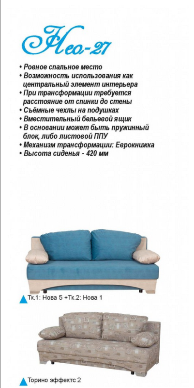 Качество, доступность и привлекательный дизайн - все это диван Нео-27. Благородные, спокойные цвета и различная обивка представленной модели помогут создать уют в вашей гостиной. Диван Нео-27 удобен и прост в использовании. Легко и быстро Вы сможете разложить его в комфортную кровать благодаря механизму трансформации «Еврокнижка». В качестве наполнения мягкие элементы облицованы эластичным листовым ППУ. Приятное дополнение - наличие отсека для постельного белья и мягкие подушки из крошки ППУ.