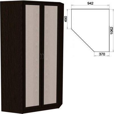 В комплект к шкафу может входить и большое зеркало. Данный угловой шкаф предлагается потребителям в пяти цветовых оттенках, полностью имитирующих натуральные сорта древесины.
