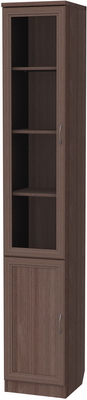 Шкаф разделен на две части. Верхняя часть спроектирована с застекленной дверцей и четырьмя полочками. Полочки одинаковые по размеру и находятся на равном расстоянии одна от одной. Расположены они таким образом, чтобы в шкафу было удобно хранить не только обычного формата книги, но и большие по размерам печатные издания или папки с документами (что очень удобно, если шкаф приобретается для использования в офисе). Благодаря внушительному объему, на полочках можно хранить большое количество книг.