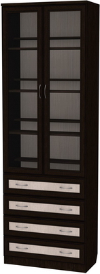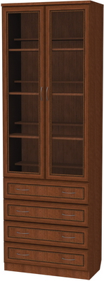 Нижняя часть шкафа оснащена четырьмя выдвижными ящичками. Аналогично, как и полки, ящики одинаковы по площади и высоте. В ящиках очень удобно хранить разнообразные мелочи, которые всегда нужны под рукой, а если шкаф будет установлен в спальной комнате, то в ящичках можно хранить постельное белье или одежду. Благодаря качественным современным механизмам, ящички легко скользят и открываются. Весь шкаф декорирован фурнитурой, воссоздающей классический стиль мебели, именно благодаря этому шкаф и будет прекрасным дополнением в любой комнате. Особенно выгодно использовать шкаф в комнате небольшого размера, поскольку, несмотря на свою вместительность, шкаф обладает действительно компактными размерами. Большой объем обеспечивается длинной и высотой шкафа.
