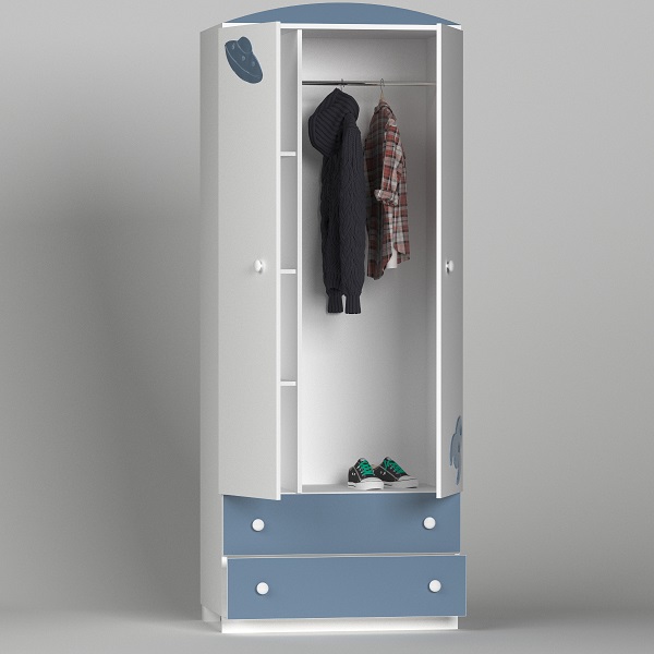 Многофункциональный просторный шкаф для одежды. Включает в себя: два больших выкатных ящика , отделение с двумя распашными дверцами внутри которого установлена штанга предназначеная под вешалки , а так же необходимый и удобный отдел оснащенный полками. В комплект шкафа входят декоративные накладки "Ракета" и "Летающая тарелка".