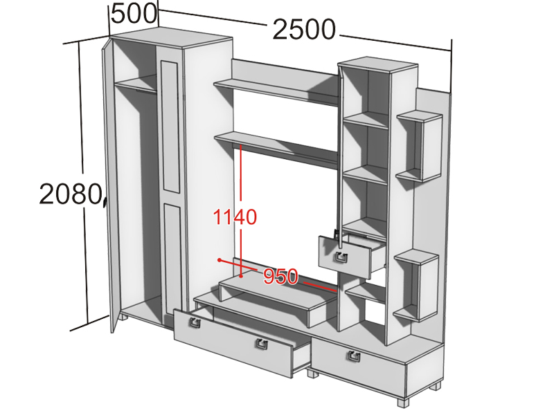 • Шкаф с двумя открытыми и тремя закрытыми полками, выдвижным ящиком, а также с двумя узкими декоративными нишами.