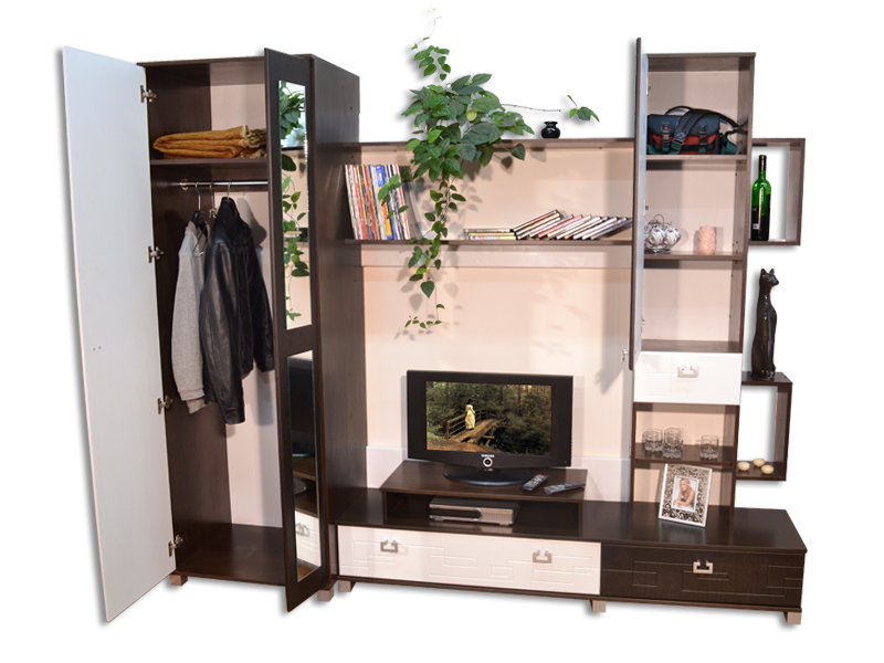 Стильная и элегантная стенка «Омега» займет достойное место в гостиной. Эта удобная, многофункциональная система хранения включает открытые и закрытые полки для размещения любимых книг, дисков и других вещей, а также отделения для одежды и посуды. Еще одно ее преимущество – возможность размещения телевизора большого формата на специальной подставке.