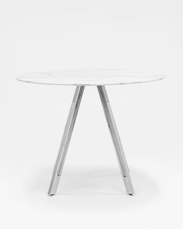 Обеденный стол с красивой стеклянной круглой столешницей белого цвета с рисунком под мрамор. Диаметр столешницы 100 см.