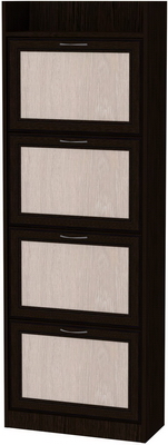 Данная модель оборудована четырьмя вместительными отделениями, куда может вместиться пару десятков комплектов обуви всей семьи. Она без проблем справится с задачей хранения и содержания в порядке и зимних, и летних пар, и даже более того – не займет много места в прихожей. Ведь даже большие прихожие нуждаются в рациональном размещении мебели. Эта высокая и неширокая тумба – именно то, что нужно. Каждое из отделений разделено на две секции, если Вы посмотрите на модель в раскрытом виде, то поймете, насколько она функциональна! Очень жаль, что зачастую этому важному элементу интерьера не придается необходимого значения. Установив дома такую тумбы, Вы обязательно оцените ее удобство. Но не только это отличает предлагаемую модель. Она станет еще и несомненным украшением Вашей прихожей. Поскольку внешнее оформление предполагает один из пяти возможных вариантов имитации ценных пород дерева, эта тумба обязательно привлечет к себе внимание Ваших гостей – она смотрится дорого и солидно. Оформлено изделие в классическом стиле, универсальном и подходящем к большинству вероятных дизайнерских решений в стилевом наполнении интерьера прихожей. Светлая и просторная прихожая предполагает светлую мебель – в таком случае молочный дуб – то, что Вам нужно. Темный благородный оттенок ясеня Шимо придаст элегантности и благородства. А в современный стиль, конечно, замечательно впишется оттенок венге.