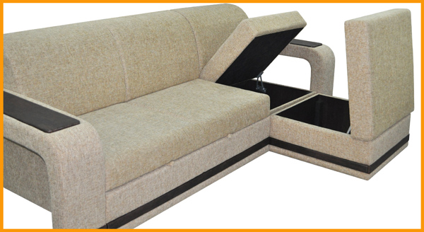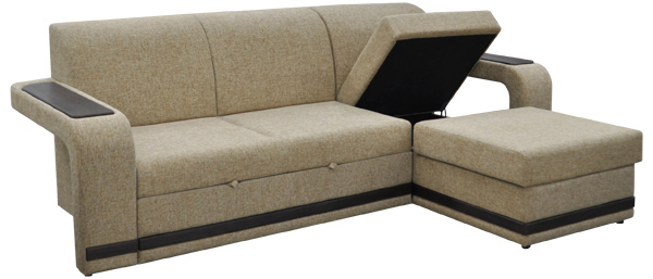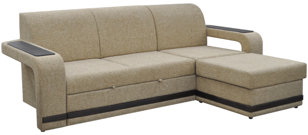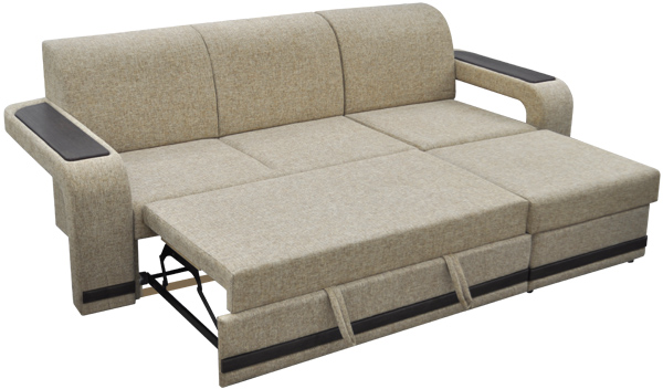 Основание сидения на основе рамки с деревянными латами. Возможность использования как центральный объект интерьера при условии дополнительного заказа задников из обивочной ткани. Механизм трансформации– дельфин (диван находится вплотную к стене, раскладка в переднем направлении). В коробчатом основании полукресла и приставного пуфа расположены емкости для хранения постельных принадлежностей. На подлокотниках и лицевой стороне дивана крепятся декоративные накладки из МДФ. Угол дивана универсальный при условии, что верхний краб- зацеп на боковой спинке дивана нужно будет перевернуть на 180 градусов для крепления подлокотника. Выкатная часть выполняется в основной ткани.