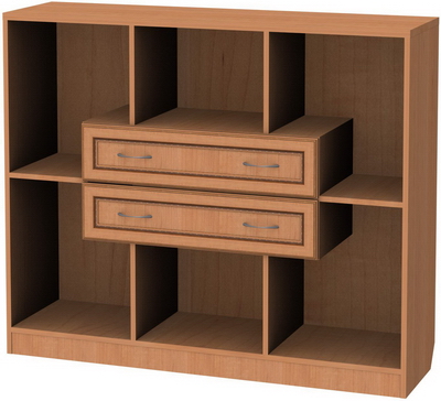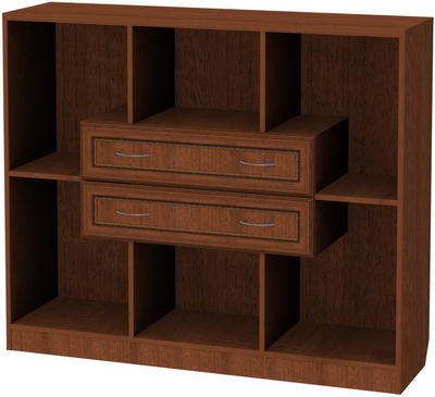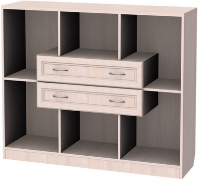 В центре композиции расположены два выдвижных ящика, глубина которых, как и самого стеллажа, составляет 37 см. Ящички оборудованы двумя ручками, при помощи которых его можно легко и быстро открыть и закрыть. Легкость скольжения роликов по направляющим, размещенным на внутренних стенках, гарантирует длительную эксплуатацию изделия без поломок. Здесь вы сможете хранить различные мелкие предметы, канцелярские принадлежности и т.п.