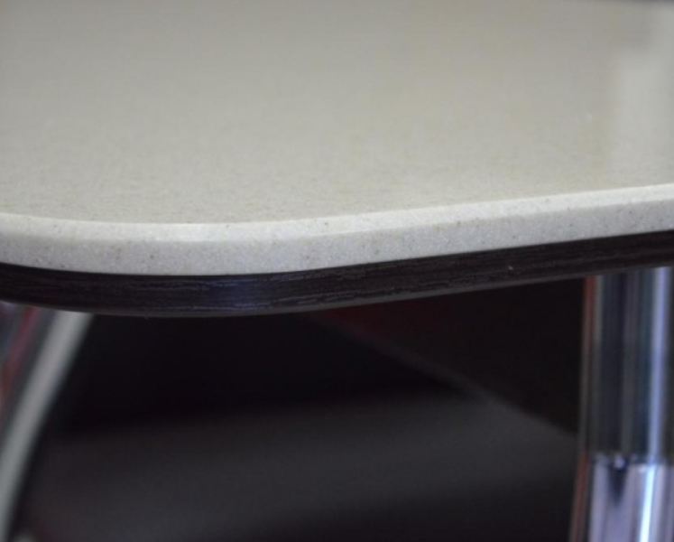 Раздвижной стол "Турин-1" (пр-во Россия). Комбинированная столешница: ЛДСП 10 мм и искусственный камень 12 мм. Центральная вставка - "бабочка" шириной 32 см позволяет легко разложить стол до размеров 70х142 см. Искусственный камень естественных расцветок является ударопрочным и практичным материалом. Полированная поверхность камня обладает мягким блеском. Торец ЛДСП облицован ПВХ-кромкой.